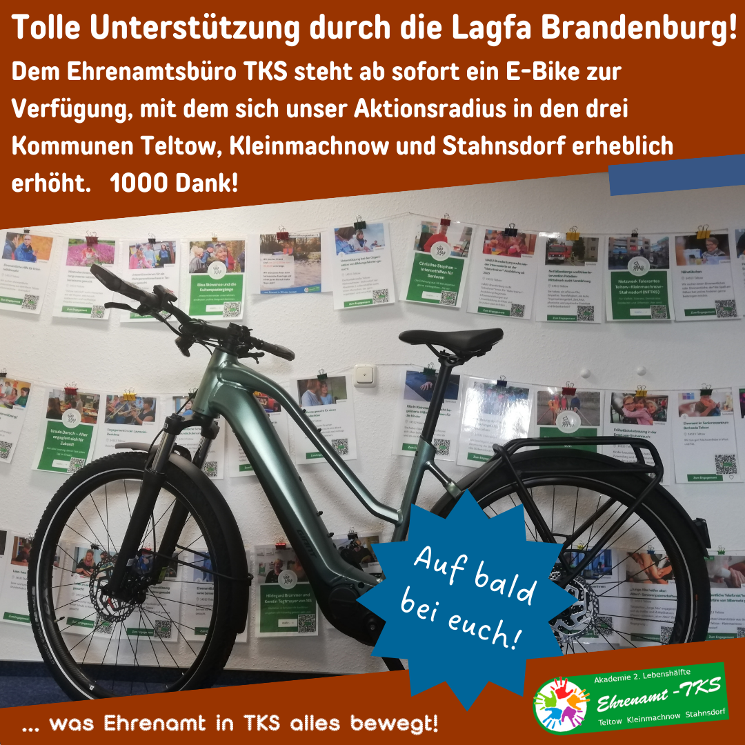 Dem Ehrenamtsbüro TKS steht ab sofort ein E-Bike zur Verfügung, mit dem sich der Aktionsradius in den drei Kommunen erheblich erhöht. 1000 Dank!