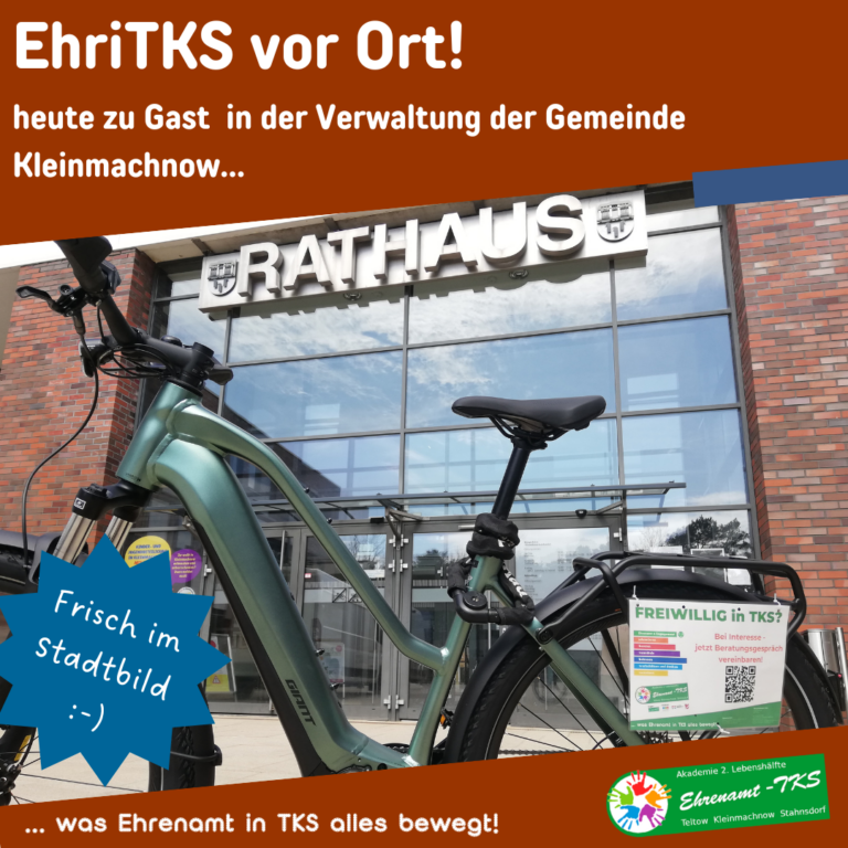 EhriTKS das neue E-Mobil für das Ehrenamtsbüro TKS, war heute mit uns unterwegs und zu Gast in der Verwaltung der Gemeinde Kleinmachnow. Thema war u. a., wie wir gemeinsam das Ehrenamt stärken können …